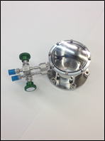 固体水素ターゲット装置 水素の氷をつくる装置。(500円玉くらいの大きさ) 純粋な水素のかたまりに種々の元素イオンビームを照射して 原子核の破壊を行い、中性子・陽子を取り出し、 新しい原素を見つける研究に取り組む。 |